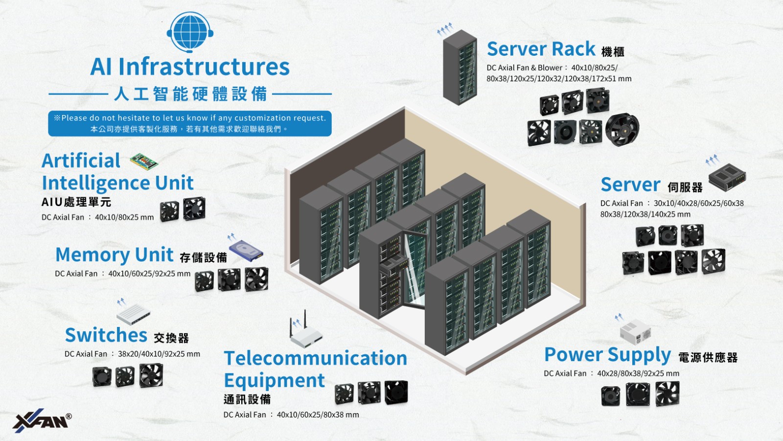 提供優秀的散熱解決方案,高轉速與高風量的產品性能,使風扇維持高水準的品質,以滿足不斷進步的網通市場。