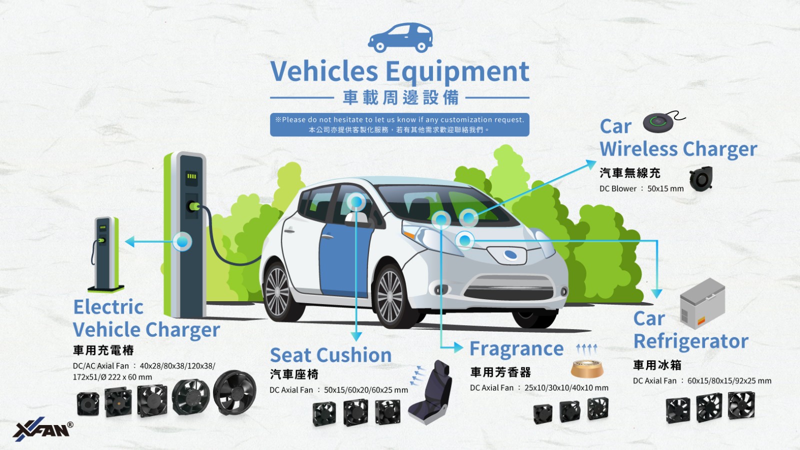 欣瑞聯科技的2510、3010、4010系列風扇,擁有節電、高轉速的性能,讓車內空間能持續芬芳,享受高質感的旅途體驗。