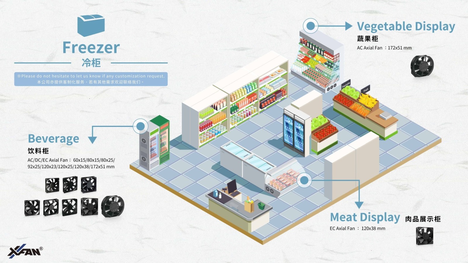 在竞争激烈的食品业领域中,最基本就是要让消费者吃的安心。而为了符合现今不同的饮食保鲜方式,市场上日渐 发展出各式各样的冷柜设备。 因此,为了替餐桌上的食材,锁住新鲜和营养,拥有良好散热、先进制冷效能的冷柜,是业者不可或缺的 利器,也是食品安全重要的一环。 欣瑞联科技提供高品质的散热风扇,有效节能、低噪音且稳定运行,陪伴食品业缔造更健康美味的饮食环境。