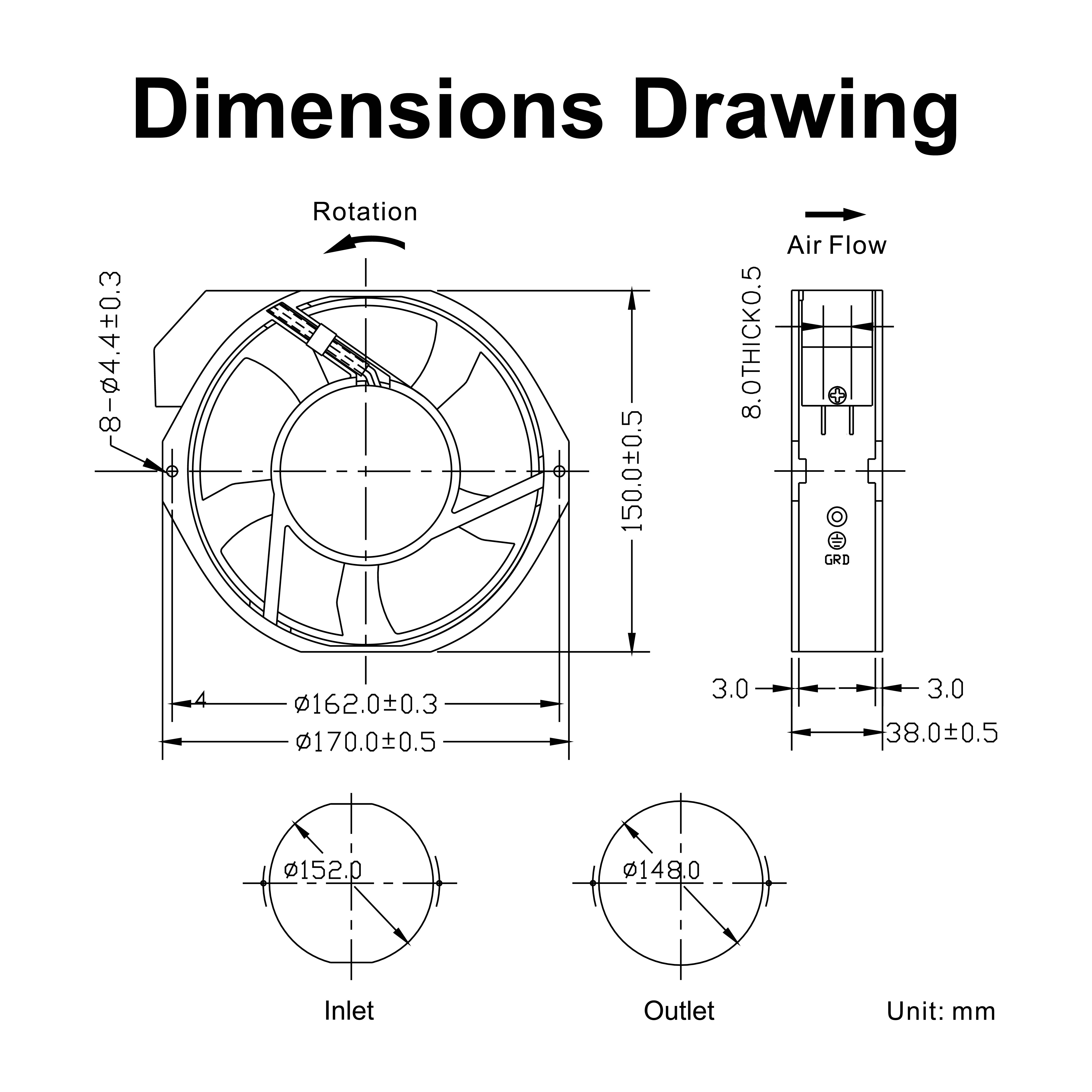 | mm | VAC | A | W | RPM | M³/hr | CFM | mmH₂O | dBA | g |