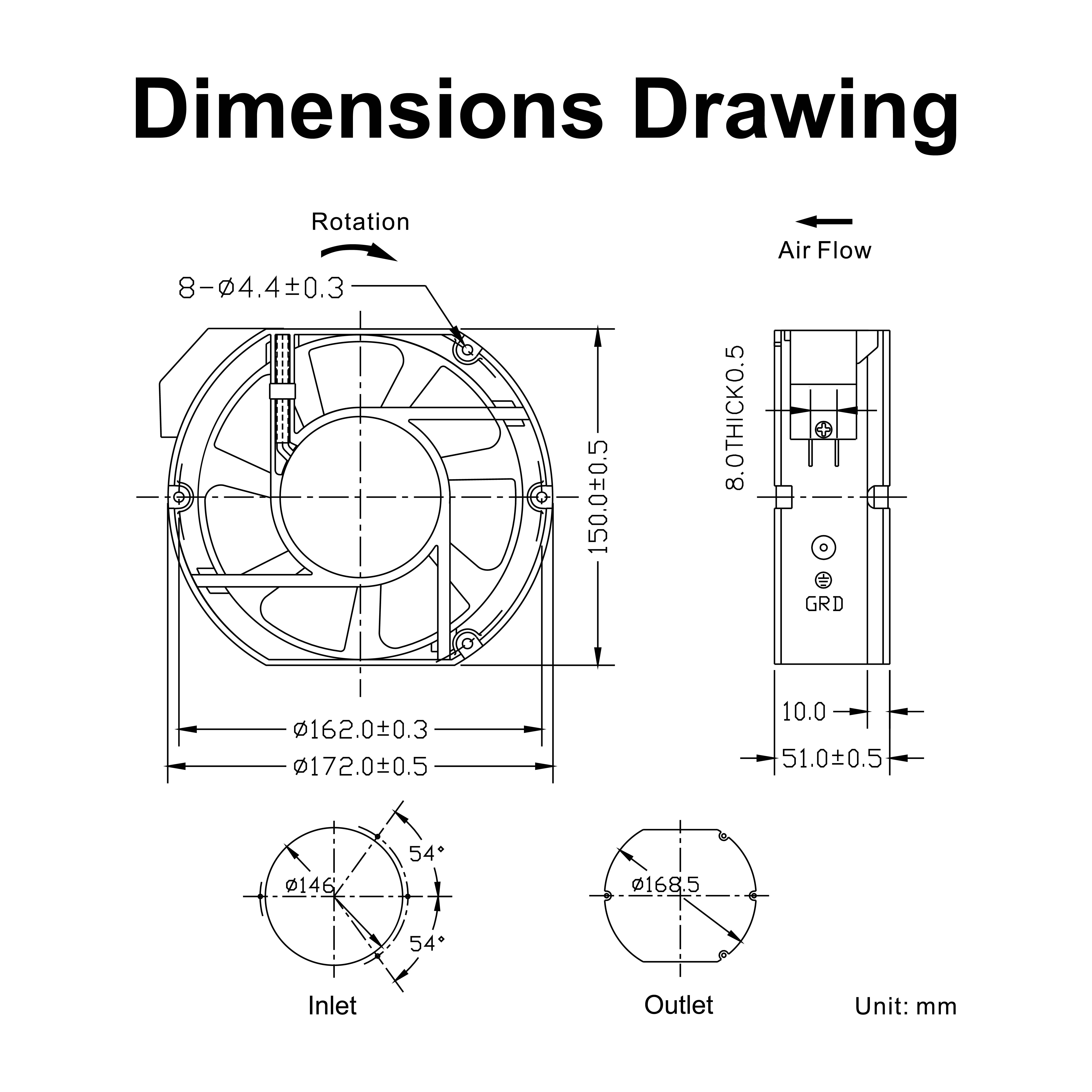 | mm | VAC | A | W | RPM | M³/hr | CFM | mmH₂O | dBA | g |