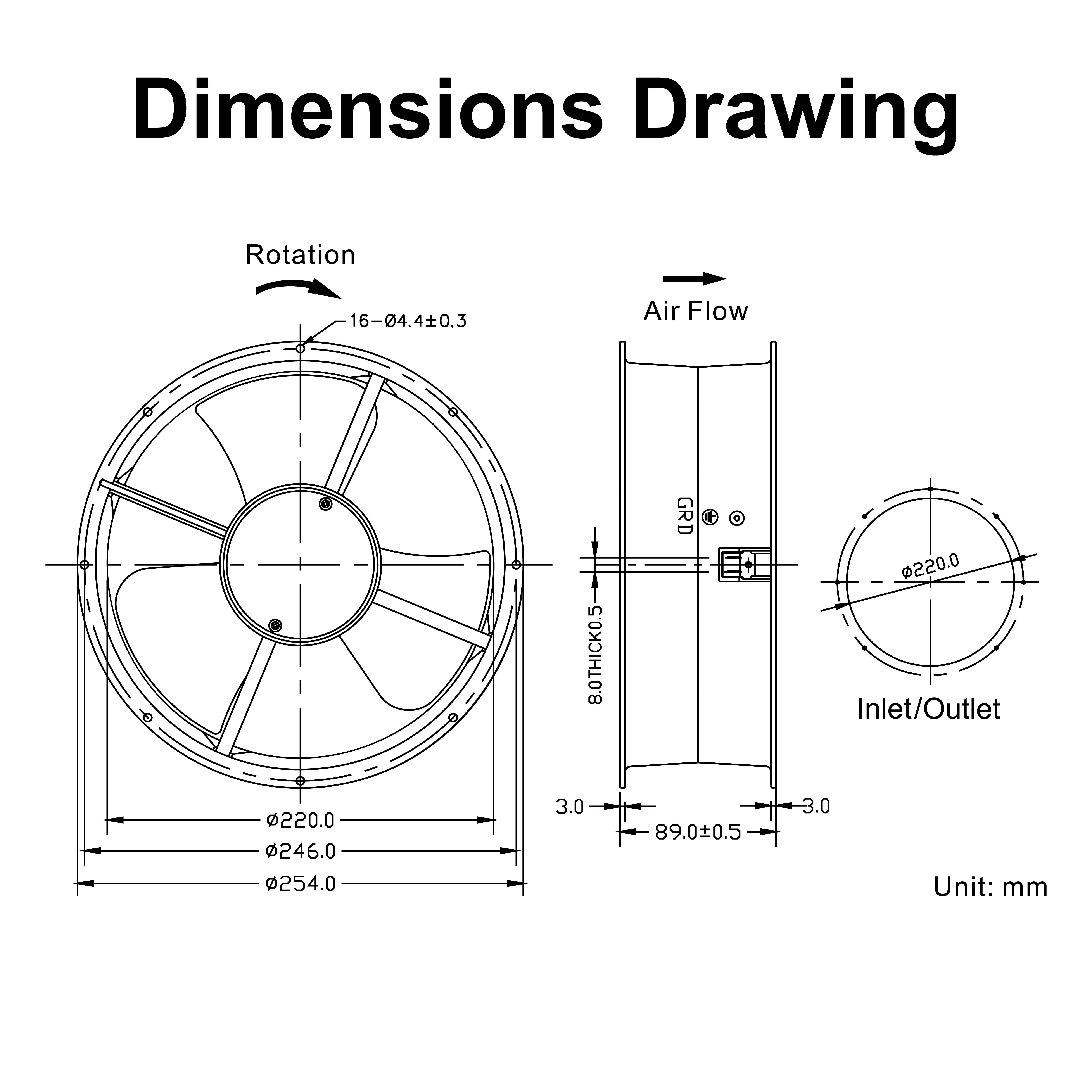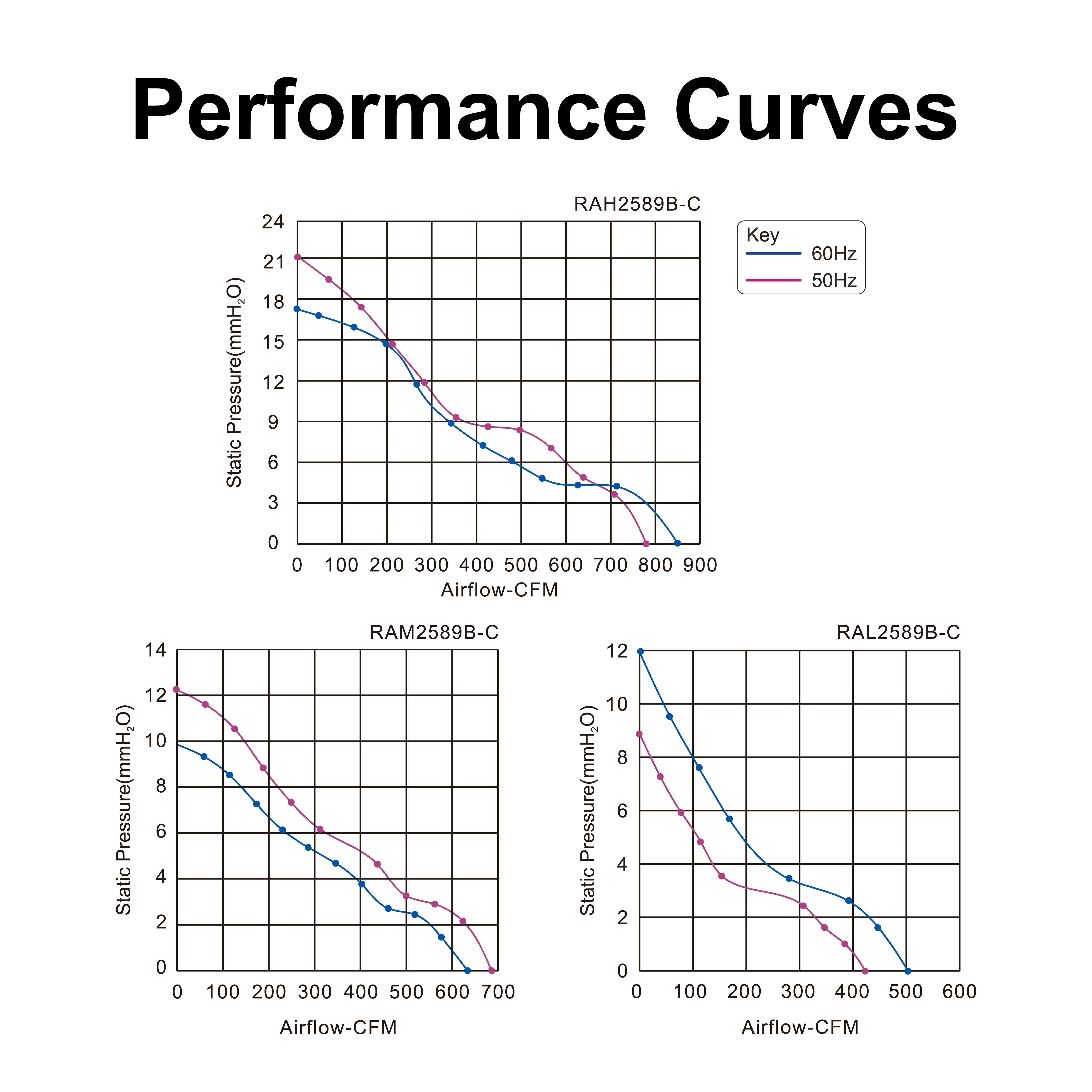 | mm | VAC | A | W | RPM | M³/hr | CFM | mmH₂O | dBA | g |