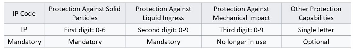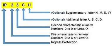 An IP rating consists of IP followed by two digits. The first digit indicates protection against solid particles, and the second digit indicates protection against liquid ingress. An optional letter can be added after the digits to denote other protection capabilities.
