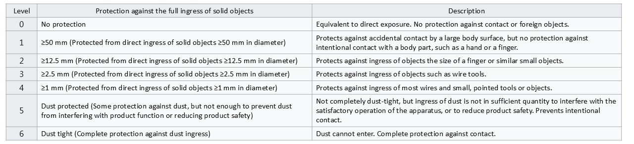 The first digit indicates the level of protection that the product's enclosure provides against the ingress of foreign solid objects, which could harm the internal components (such as electronic or mechanical parts).