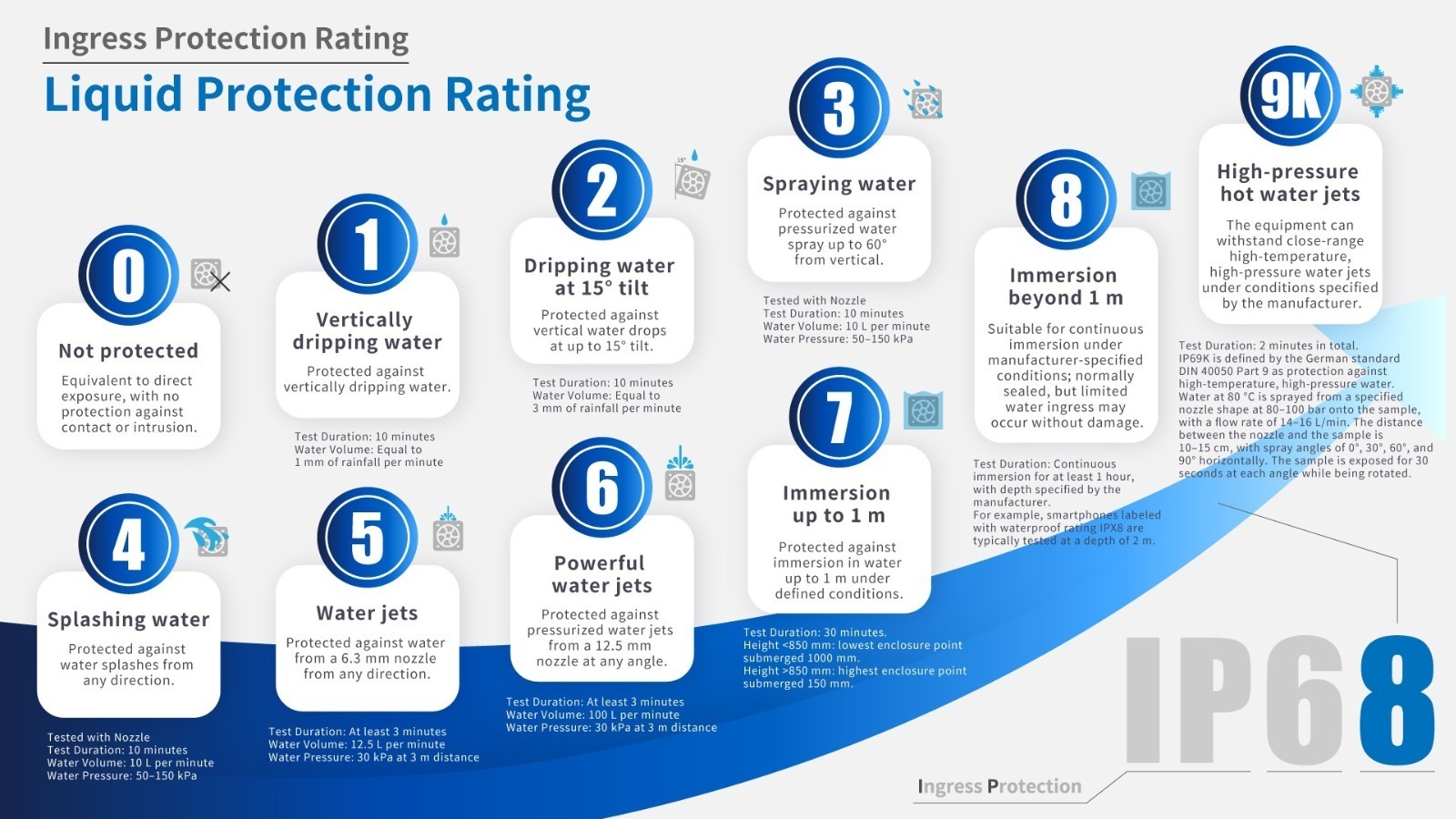 Products often boast waterproof, dustproof, or IP68 ratings—but what do they really mean? Let’s break it down with easy-to-understand charts!