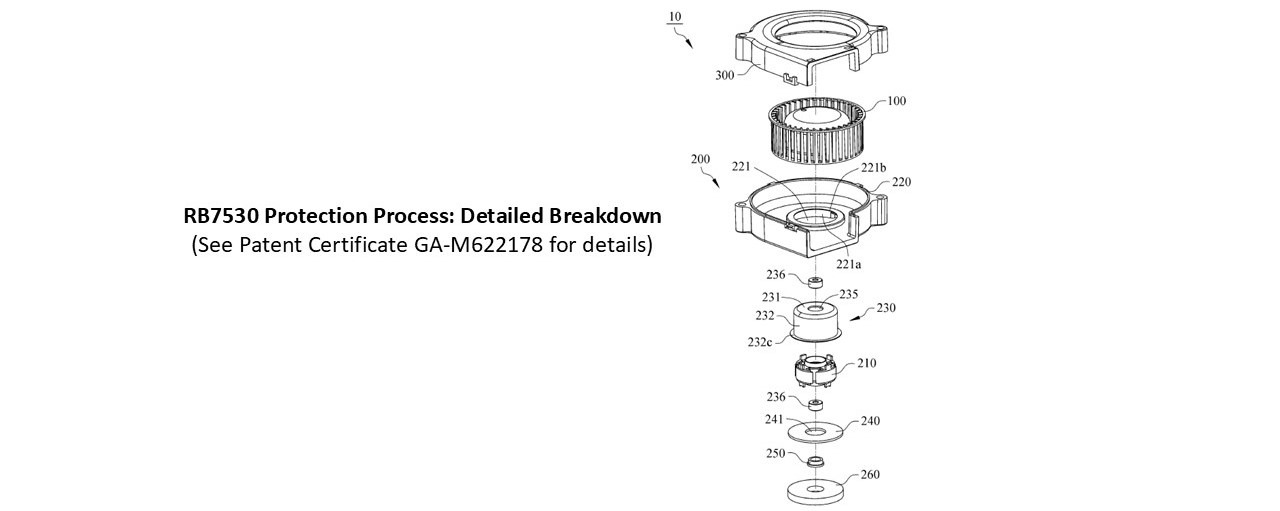 As technology advances, fan operating environments are becoming more demanding. To prevent system failures from fan abnormalities, we must continuously improve our fans' protection levels. To meet our customers' needs, we developed various protection technologies for different IP ratings, including IP21, IP54, IP55, and IP68, which ensure cost-effectiveness and performance. This is the basis for our new RB7530 model. We have upgraded the RB7530's protection to IP68 and validated its PQN performance to meet customer requirements. The technology behind this enhanced protection has been granted a patent in Taiwan, Patent No. GA-M622178.