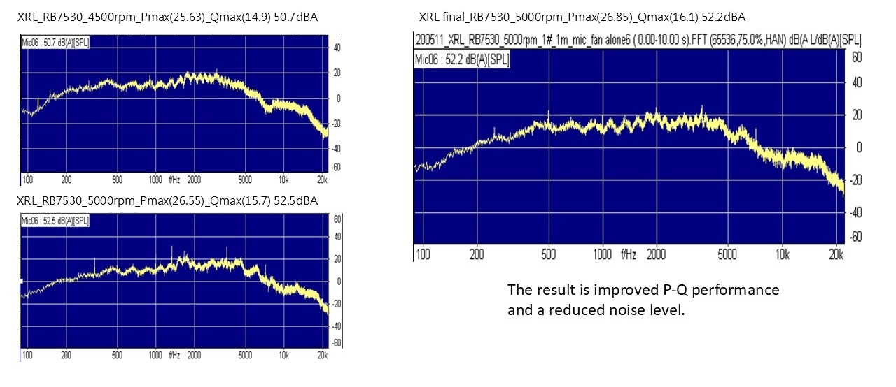 Through the design, improvement, and testing described above, the RB7530 model has achieved an IP68 protection rating and enhanced PQN performance. As this fan is a custom-designed product, the specifications are for reference only. For further needs, please refer to the RB7530 specifications in the XRL catalog. We can also custom-design and tailor a fan model and specifications to meet your system's specific speed requirements.