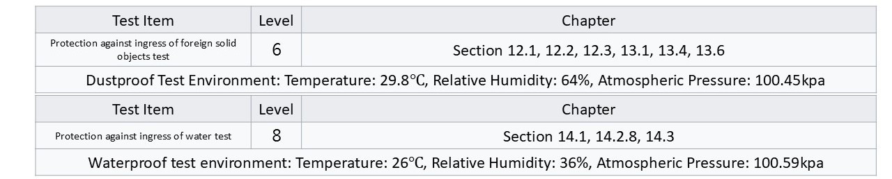 1. Reference Standards: CNS14165 C1147(104.3.31), Degrees of protection provided by enclosures (IP Code)