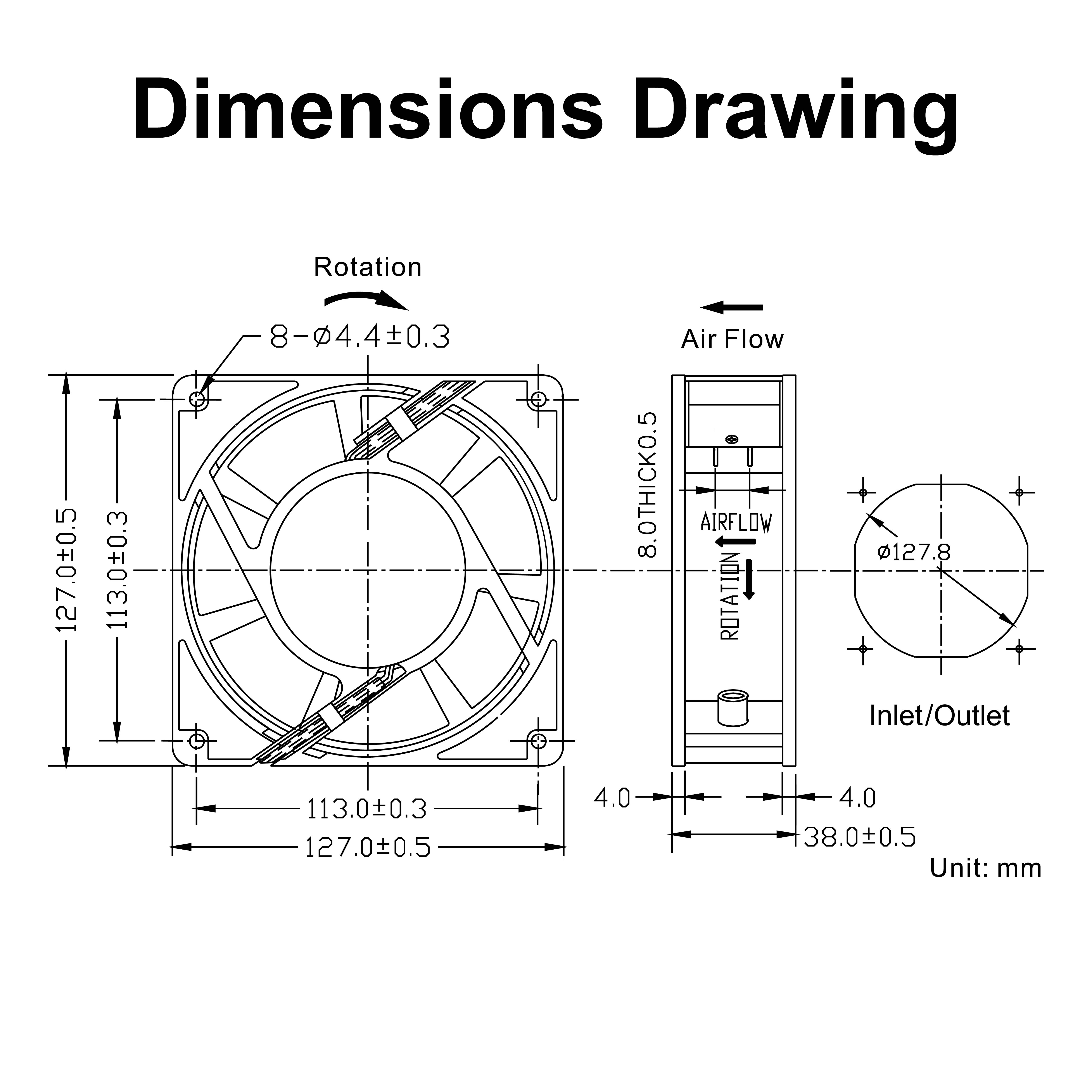 | mm | VAC | A | W | RPM | M³/hr | CFM | mmH₂O | dBA | g |