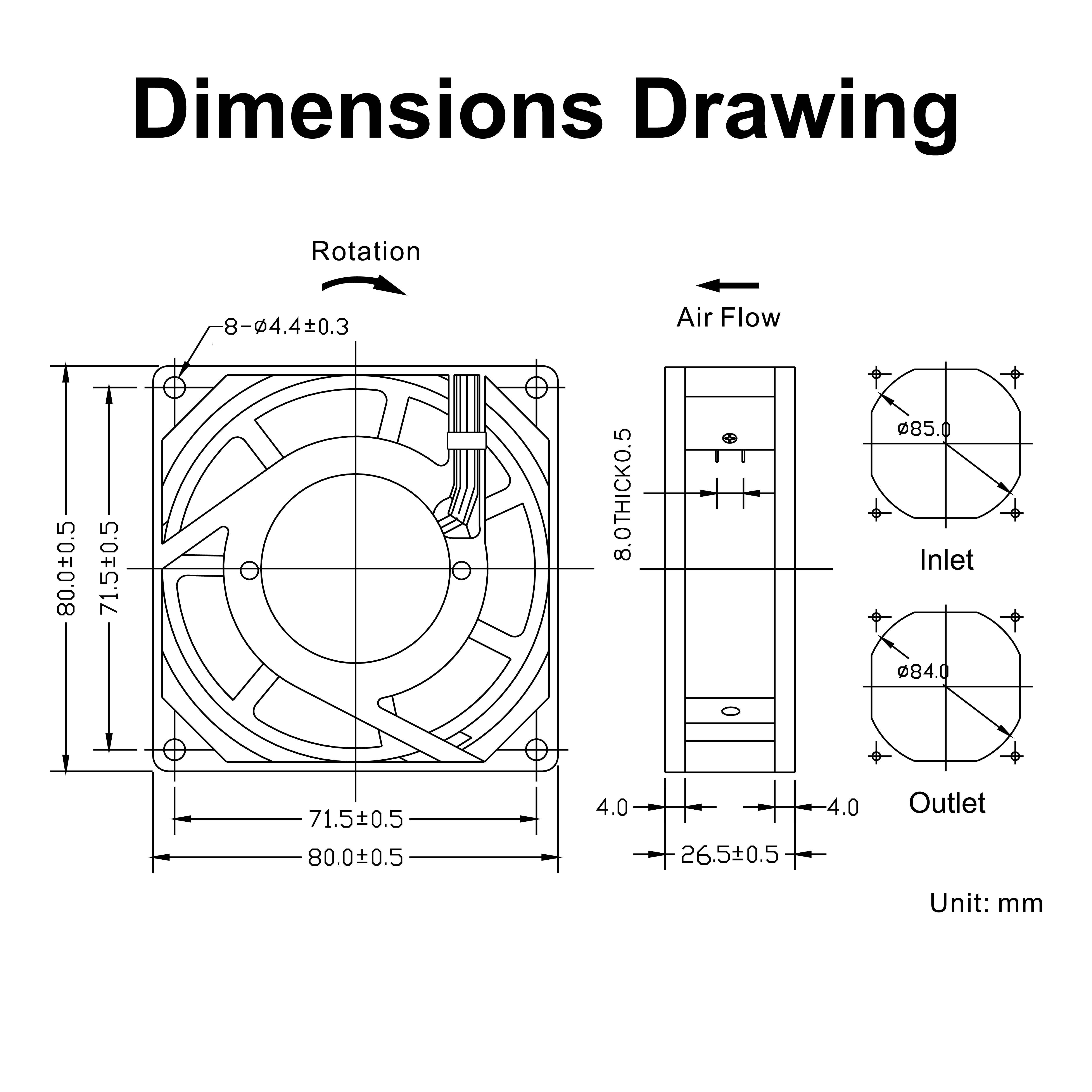 | mm | VAC | A | W | RPM | M³/hr | CFM | mmH₂O | dBA | g |