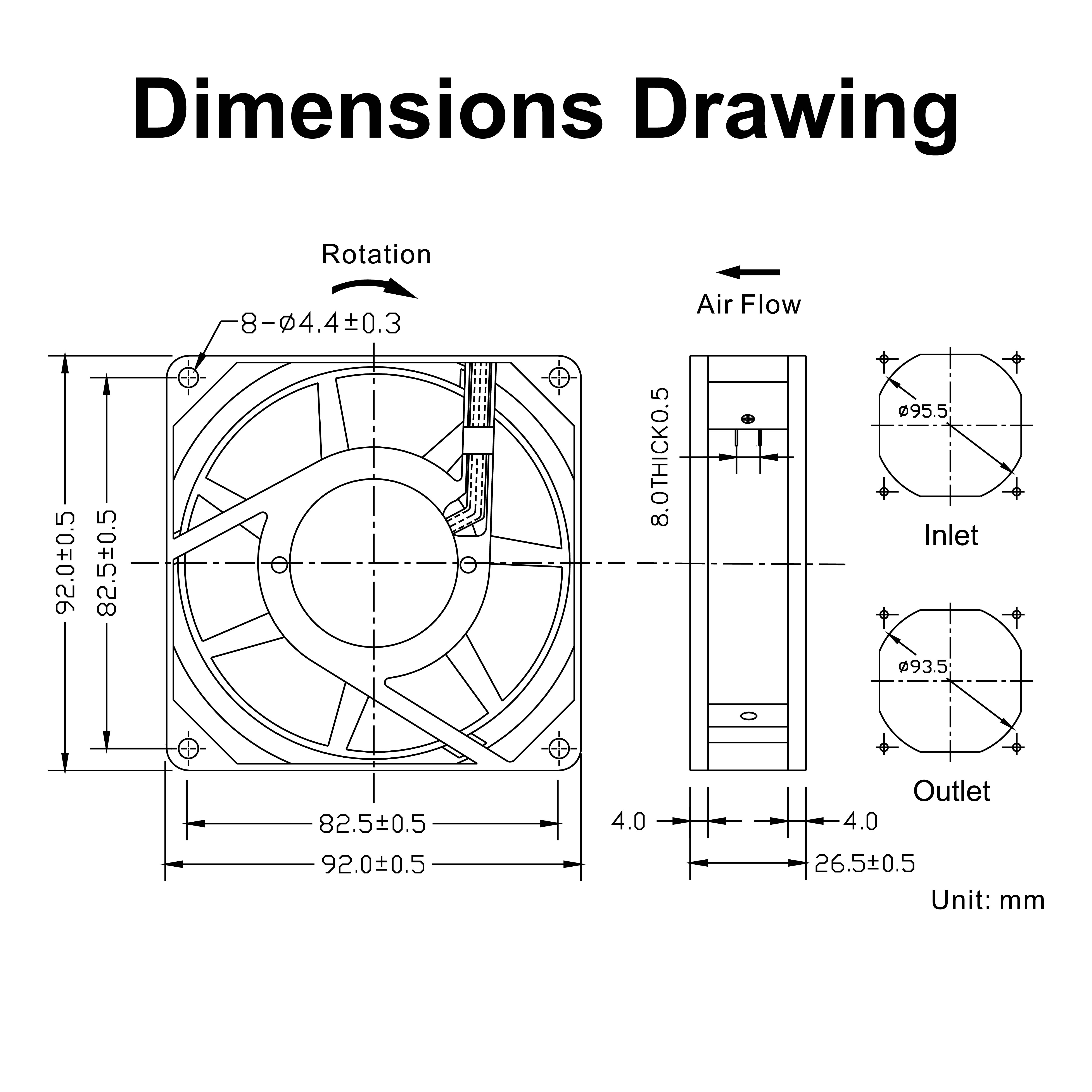 | mm | VAC | A | W | RPM | M³/hr | CFM | mmH₂O | dBA | g |