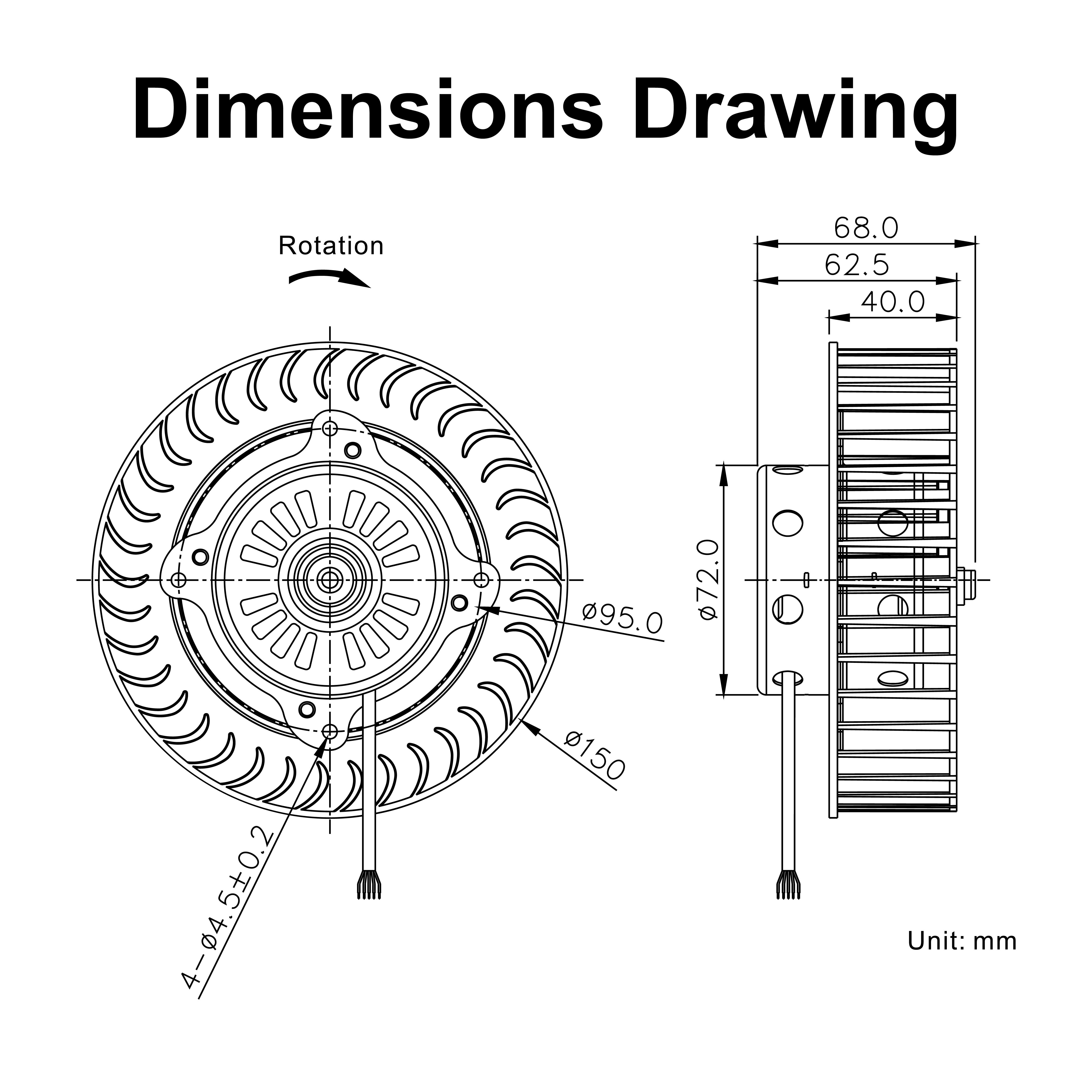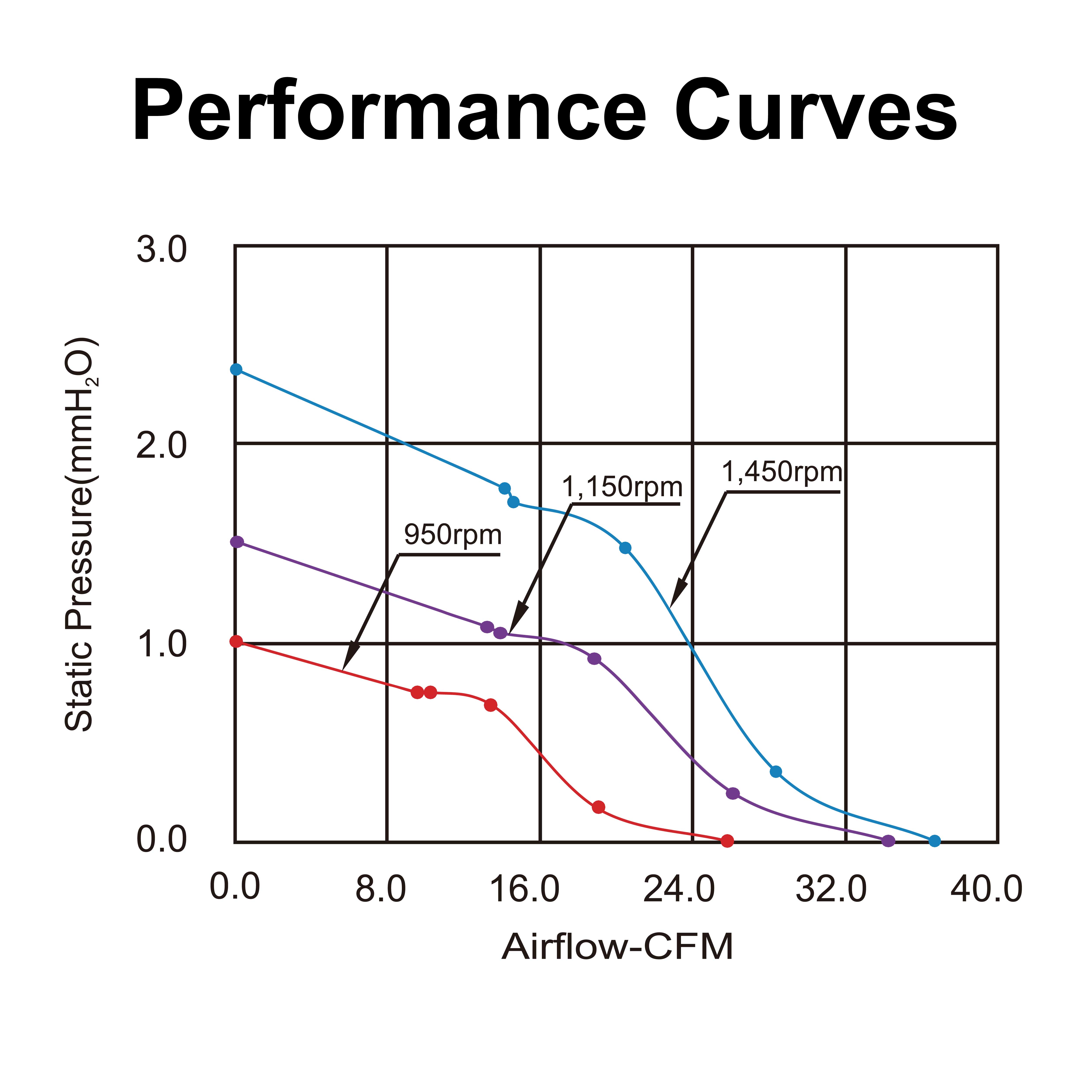 | mm | VAC | A | W | RPM | M³/hr | CFM | mmH₂O | dBA | g |