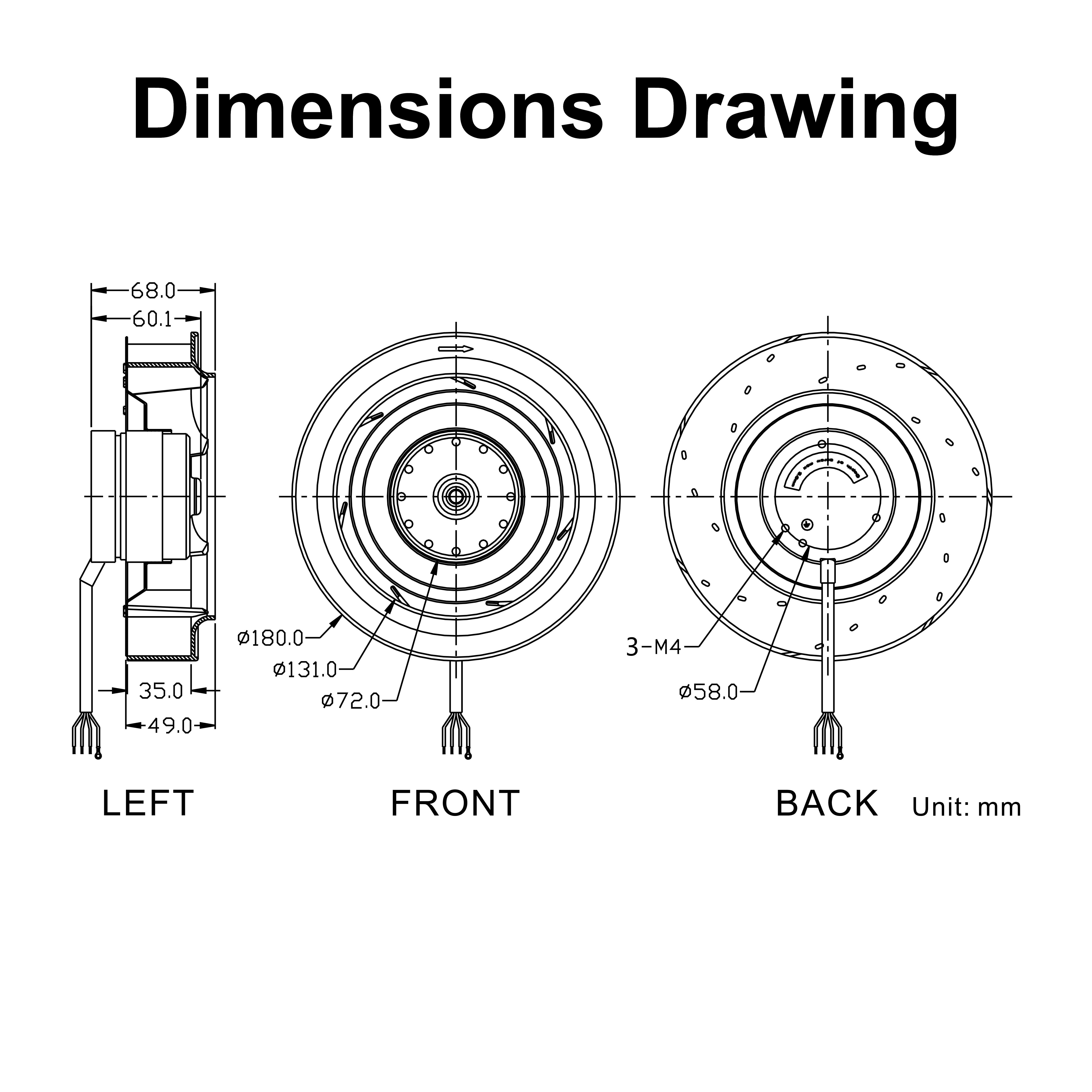 | mm | VAC | A | W | RPM | uf | CFM | mmH₂O | dBA | g |