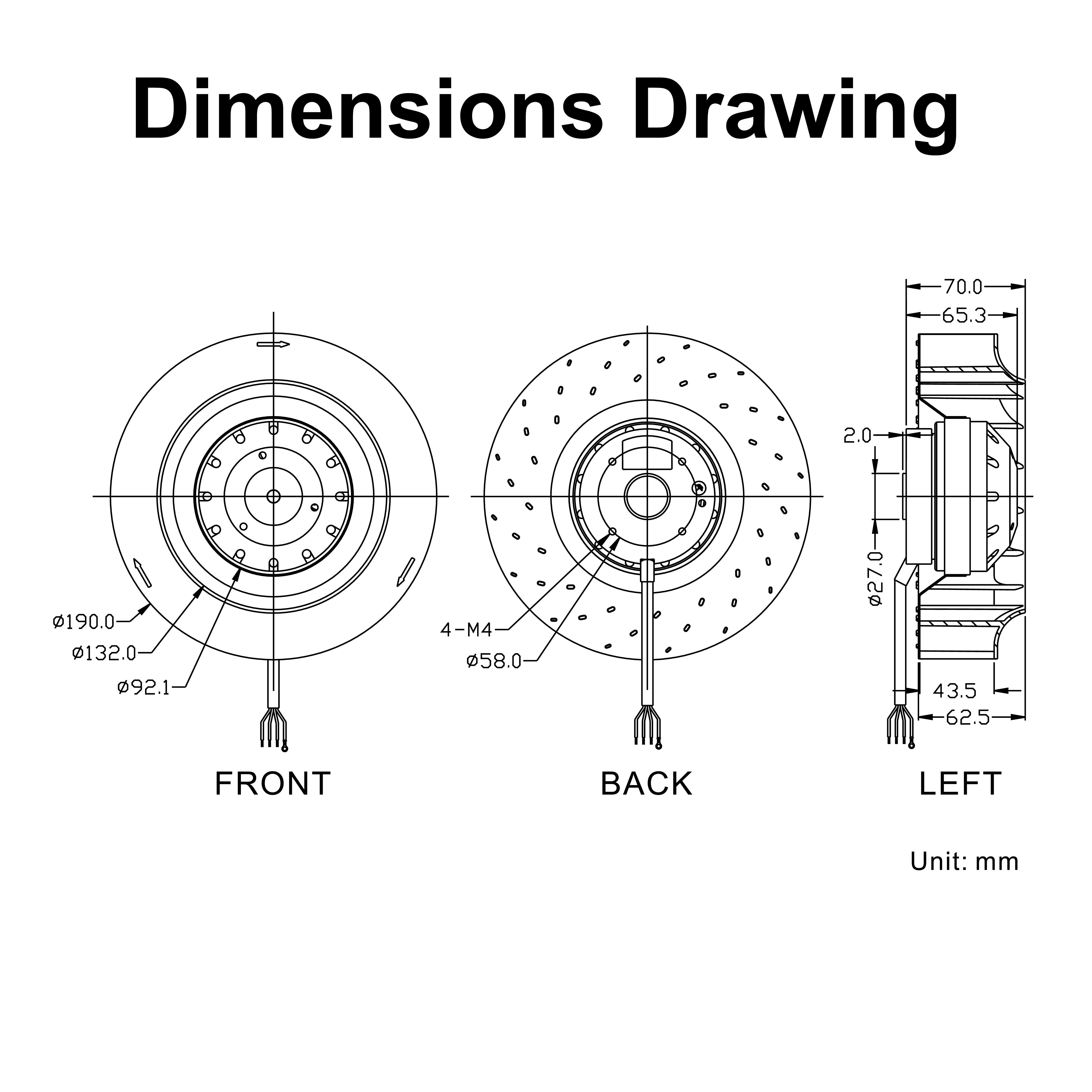 | mm | VAC | A | W | RPM | uf | CFM | mmH₂O | dBA | g |