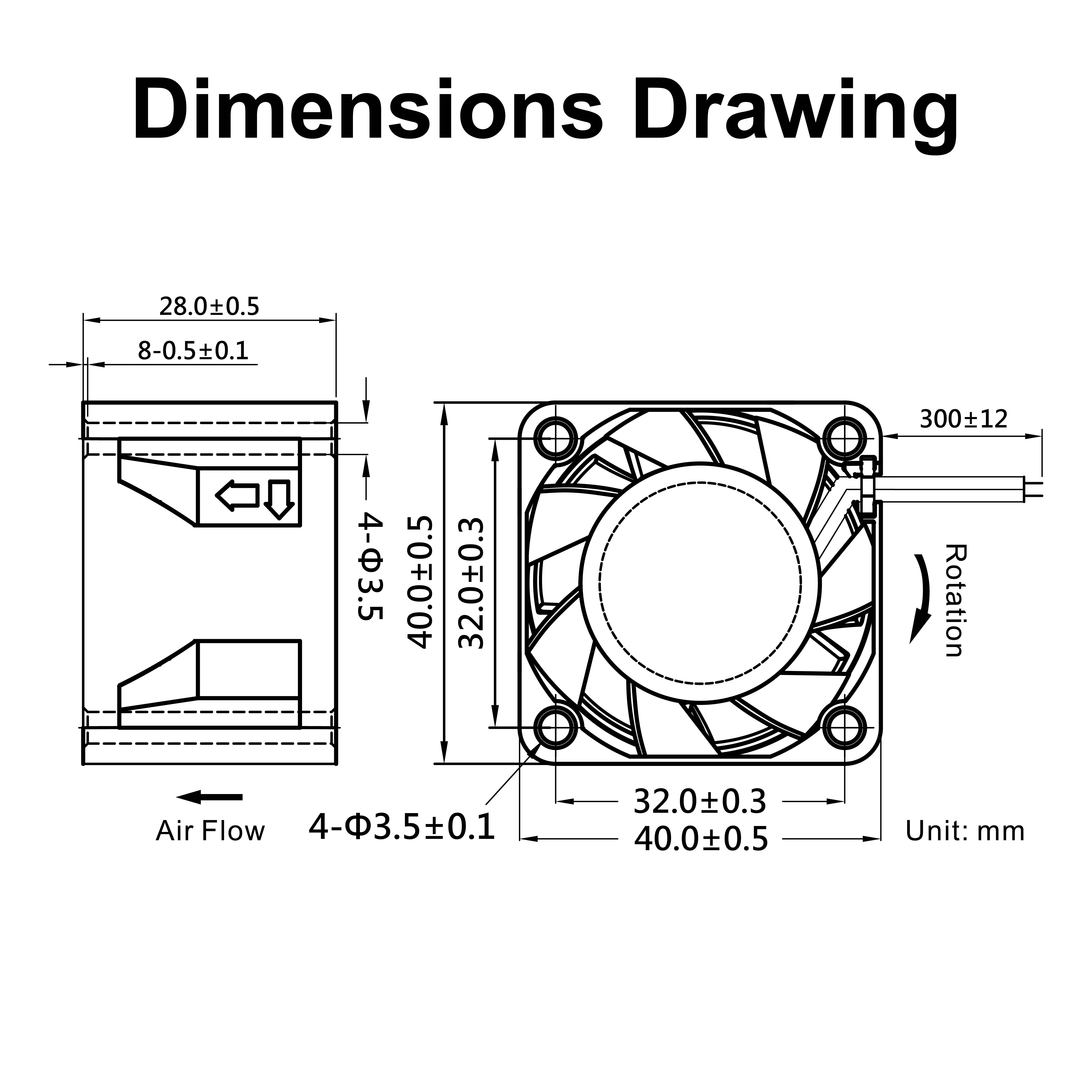 | mm | VDC | VDC | A | RPM | CFM | mmH₂O | dBA | g | FG | RD | TC | PWM |